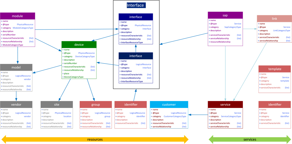 Podstawowy model danych, bazujący na TMF opisujących zasoby i usługi