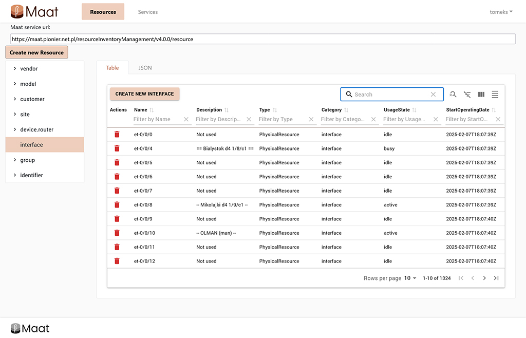 Architektura aplikacji Maat została zaprojektowana w sposób modularny i skalowalny, umożliwiający jego elastyczne dopasowanie do potrzeb dużych i złożonych środowisk sieciowych, takich jak PIONIER. Centralnym elementem rozwiązania jest pojedyncza, zunifikowana baza danych typu non-SQL, oparta o schematy danych (ang. data schemas) opisujące zarówno zasoby fizyczne, logiczne, jak i usługi. Każdy z tych elementów – urządzenia, połączenia, instancje usług – jest modelowany jako obiekt posiadający dwukierunkowe relacje z innymi zasobami, co pozwala odwzorować rzeczywistą strukturę urządzeń oraz sieci. Dostęp do danych realizowany jest przez standardowe API TM Forum (TMF638 i TMF639) zapewniające pełną funkcjonalność CRUD (Create, Read, Update, Delete), co umożliwia integrację z systemami automatyzacji i orkiestracji. Architektura obejmuje także rozbudowany interfejs GUI, który automatycznie dostosowuje się do zdefiniowanych schematów danych oraz moduł EventListener, pozwalający monitorować zdarzenia w aplikacji, np. dodanie, modyfikację lub usunięcie zasobu. Dodatkowe komponenty, takie jak moduł AAA (Authentication, Authorization, Accounting) zintegrowany z Keycloak oraz system logowania i monitorowania oparty o Graylog lub Grafana Loki, zapewniają kontrolę dostępu i działania aplikacji. Dzięki takiemu podejściu Maat nie jest jedynie statycznym repozytorium danych, lecz aktywnym centrum wiedzy o sieci, zdolnym do komunikacji, reagowania i współdziałania z innymi elementami ekosystemu zarządzania infrastrukturą.